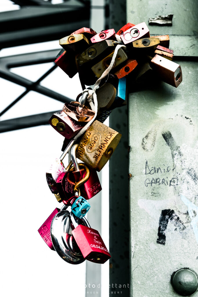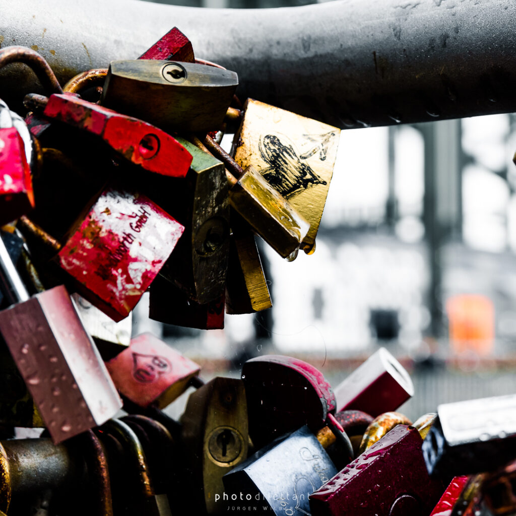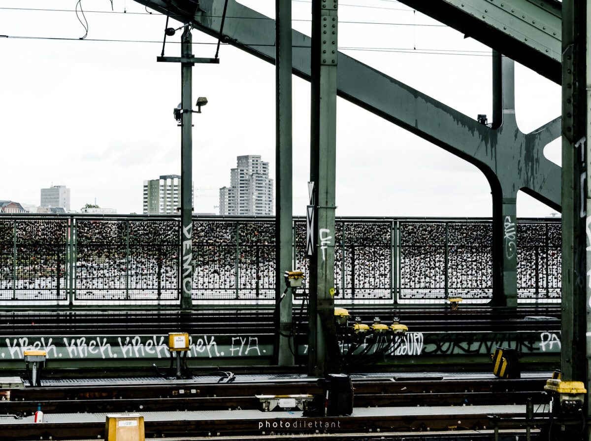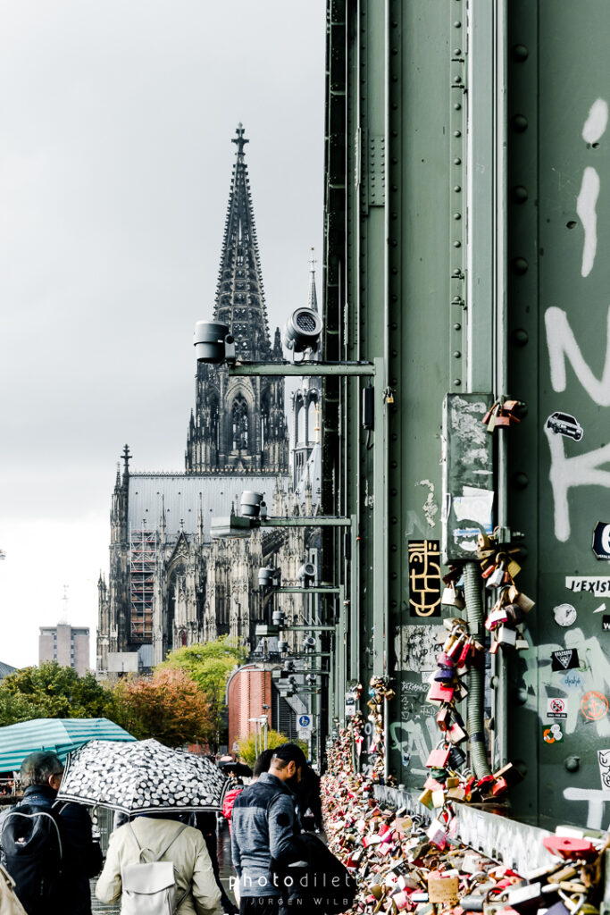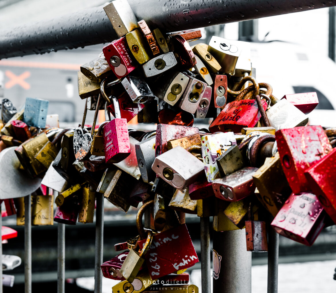 Im dritten Teil der Fotoreihe aus Köln geht es vom Dom über die Hohenzollernbrücke auf die andere, die richtige Rheinseite. Auf der Brücke geht es vorbei an unzähligen Liebesschlössern, ihre Zahl wird mittlerweile auf etwa 500.000 und mehr geschätzt, so genau weiß das niemand. 2018 wollte die Deutsche Bahn die Schlösser zum Schutz der Brückenkonstruktion entfernen lassen, ließ sie dann aber doch hängen. Das zusätzliche Gewicht der Schlösser stellt für die Brücke wohl keine Gefahr da. Angekommen auf der anderen Seite ergeben sich dann auch ein paar schöne Panoramablicke auf die Kölner Altstadt. Sieht dann doch gar nicht so schlecht aus…
